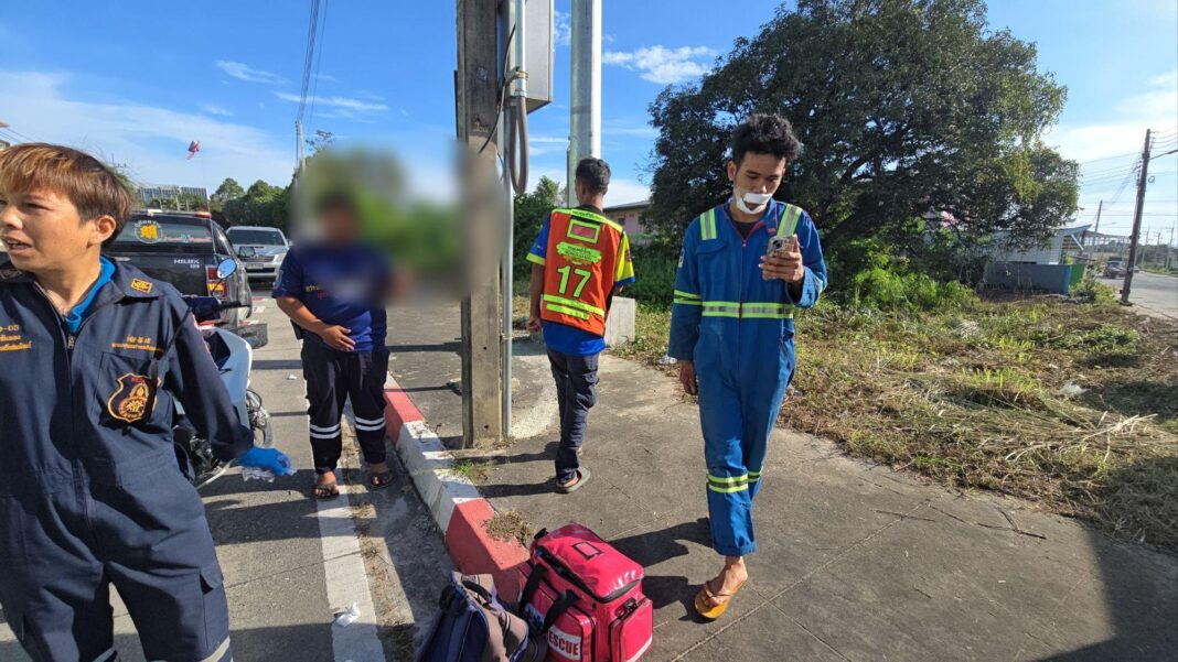 The Sawang Prateep Sriracha Rescue Center received reports of a crash involving two motorbikes with multiple injuries. Rescue teams and officers from Laem Chabang Police Station rushed to the scene. Upon arrival, responders found that both motorbikes had been moved to the roadside to prevent traffic congestion after photos of the collision were taken. The four injured individuals were identified as Phayungsak Chaisang, 25, and Chokchai Thongthai, 21, riding a black Honda Wave and Adisorn Chanduangsri, 21, and Kittiwan Panya, 21, on a pink Honda Super Cub. All four are factory workers.
